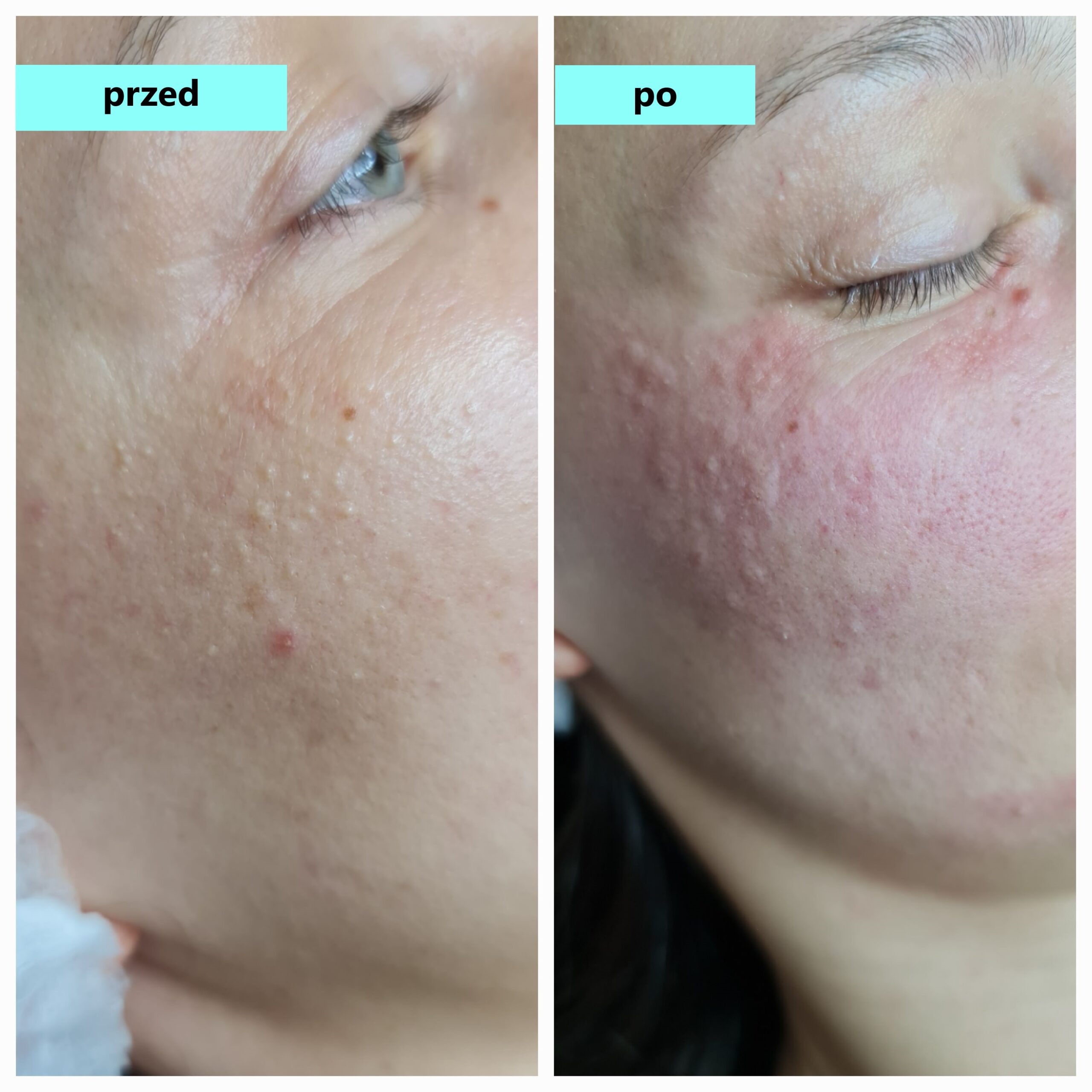 Po zabiegu na skórze może pojawić się niewielkie zaczerwienienie lub strupki, które goją się w ciągu kilku dni.
